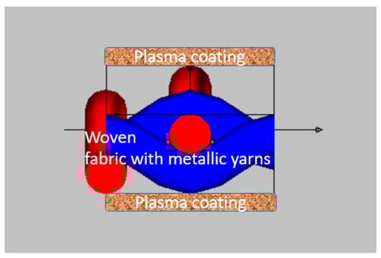 Scheme of the woven fabric with inserted metallic yarns and plasma coating.