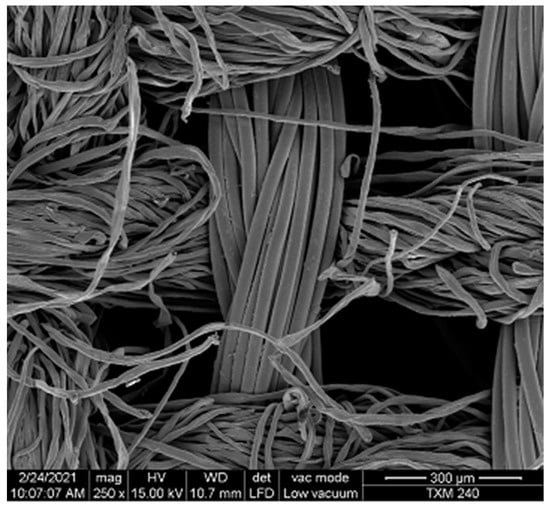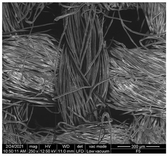SEM image of fabric with inserted stainless steel yarns F1 (250×).