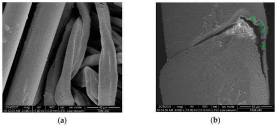 SEM images were meant to evidence the stainless steel and the silver yarns in the fabric structure (Figure 5 and Figure 6). The investigation of copper coated samples, presented in Figure 7, shows that the film is compact and covers the yarns uniformly. A rupture of the film along one fiber allowed evaluating the film thickness, with variations caused by the actual positioning into the field of view. Also, the copper coating seems to present a columnar structure of the deposit.