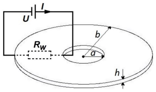 where a is the inner diameter of the circle, b the outer diameter, h the fabric thickness and Rw—the measured resistance value by ohmmeter [Ω] (Figure 8).