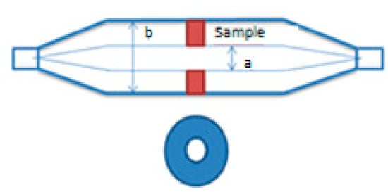 The scheme of the coaxial TEM cell is presented in Figure 9, which also includes the shape of the samples tailored for testing the EMSE with this system.