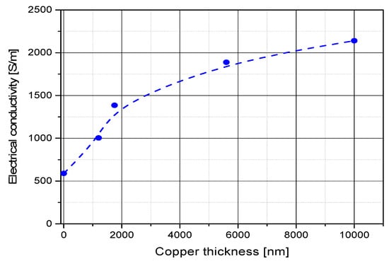 Dependence of the electrical conductivity of the fabrics with inserted silver yarns on the thickness of copper layer. The dot curve is just for eye guiding for the obtained trend.