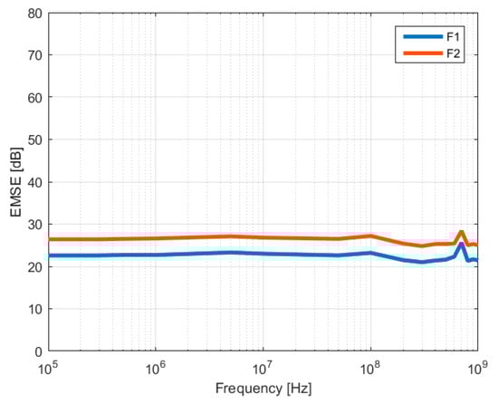 In the case of the fabrics with stainless steel yarns (F1), the model estimates quite well the fabric with inserted yarns, with differences in the range 1–8 dB over the whole frequency range. An even better fitting of the measured EMSE is obtained for the fabric with inserted yarns and copper coating (F2) by the EMSEgrid and the additional EMSElayer relation, with differences between the modelled and measured values less than 5 dB, as shown in Figure 19.
