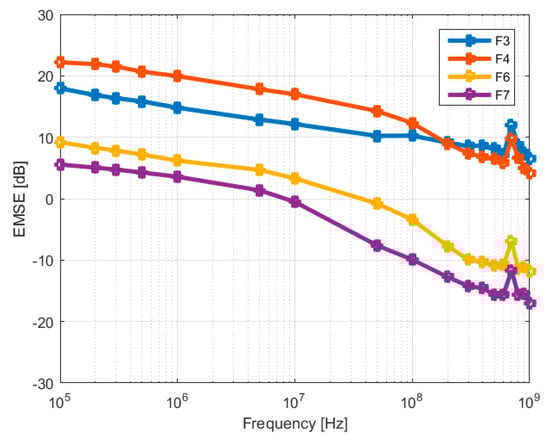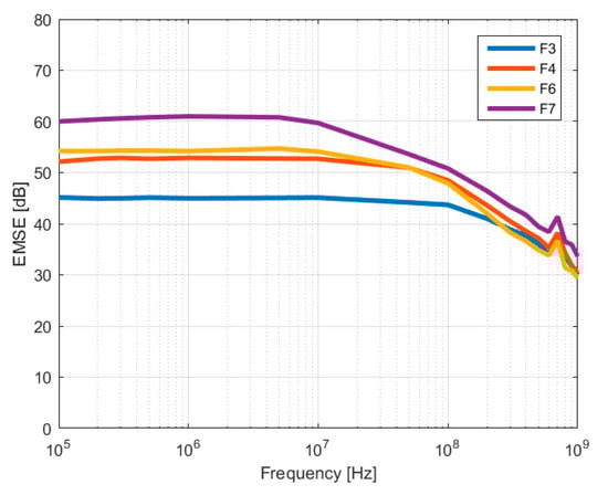 The fabrics F4 and F5 show a significant difference between modelled and measured values of around 20 dB on the frequency range 105 to 107 Hz, which could be explained by the low values of the EMSElayer model in case of 103 nanometer values: 1200 nm (F4) and 1750 nm (F5). On the other hand, the EMSElayer model has significant increasing values for 5600 nm (F6) and 10,000 nm (F7), which makes that EMSEtotal reaches the measured values for F6 and F7, as shown in Figure 20. These results show that the steady increase of the fabric conductivity upon copper coating, of 3.2 times for F6 and 3.6 times for F7 with respect to the uncoated fabric, plays an important role in the model of the EMSElayer. These facts suggest a significant role played by the conductivity of the components in the model. One has to consider that this type of composite EM shield is quite difficult to model and that the proposed relation of EMSE includes all the parameters of the electric structures of this composite shield.