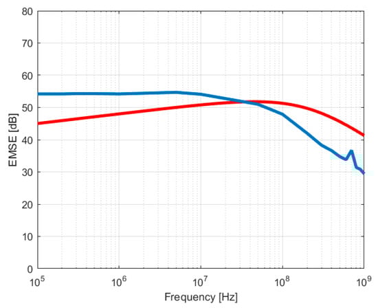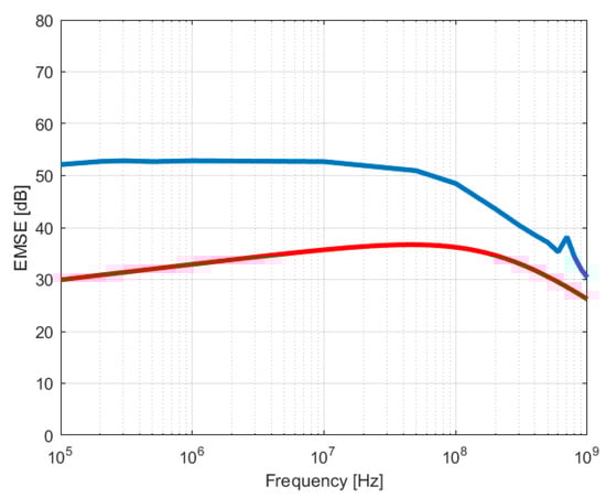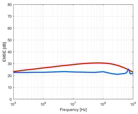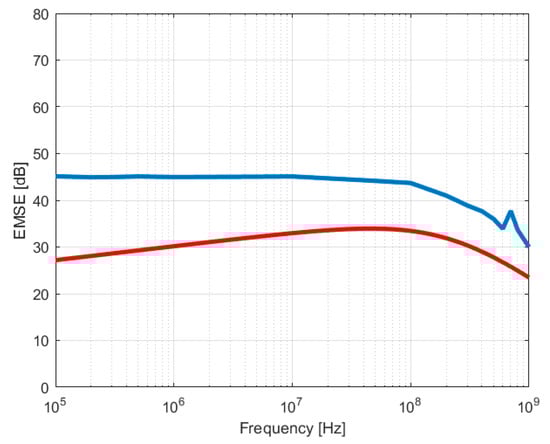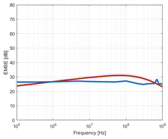 By applying the general Equation (3) for the calculation of EMSE for the samples involved in the present study, we obtained the red curves in Figure 13 and Figure 14 for the case of fabrics with inserted stainless steel yarns, and respectively the red curves in Figure 15, Figure 16, Figure 17 and Figure 18 for the case of fabrics with inserted silver yarns, and with different copper layer thickness.