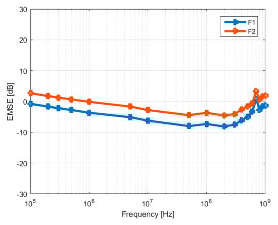 Measured EMSE for samples with stainless steel yarns (F1–F2).