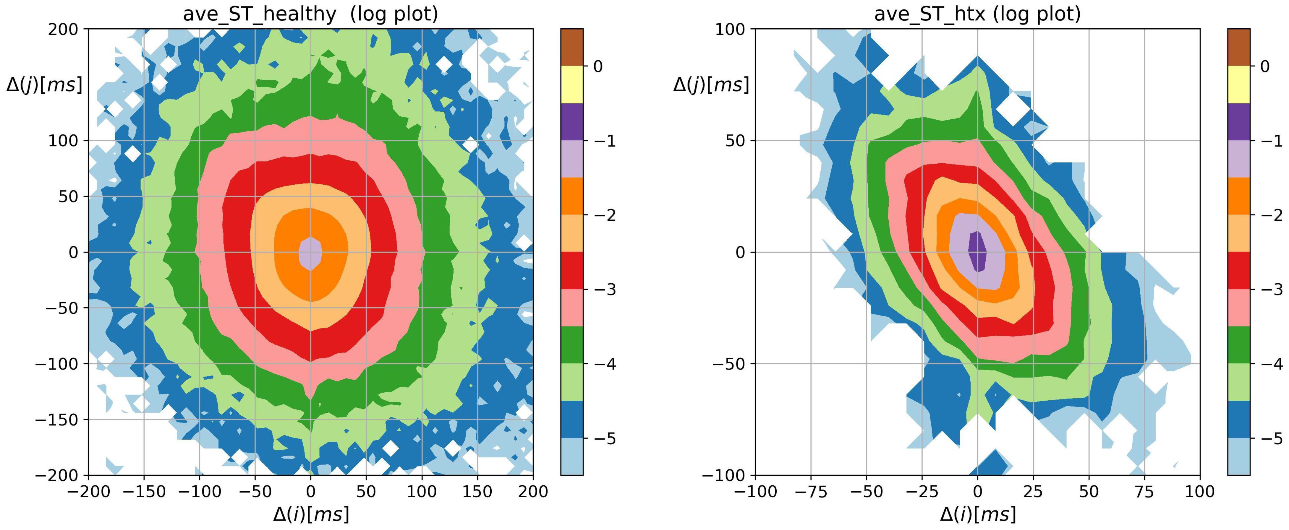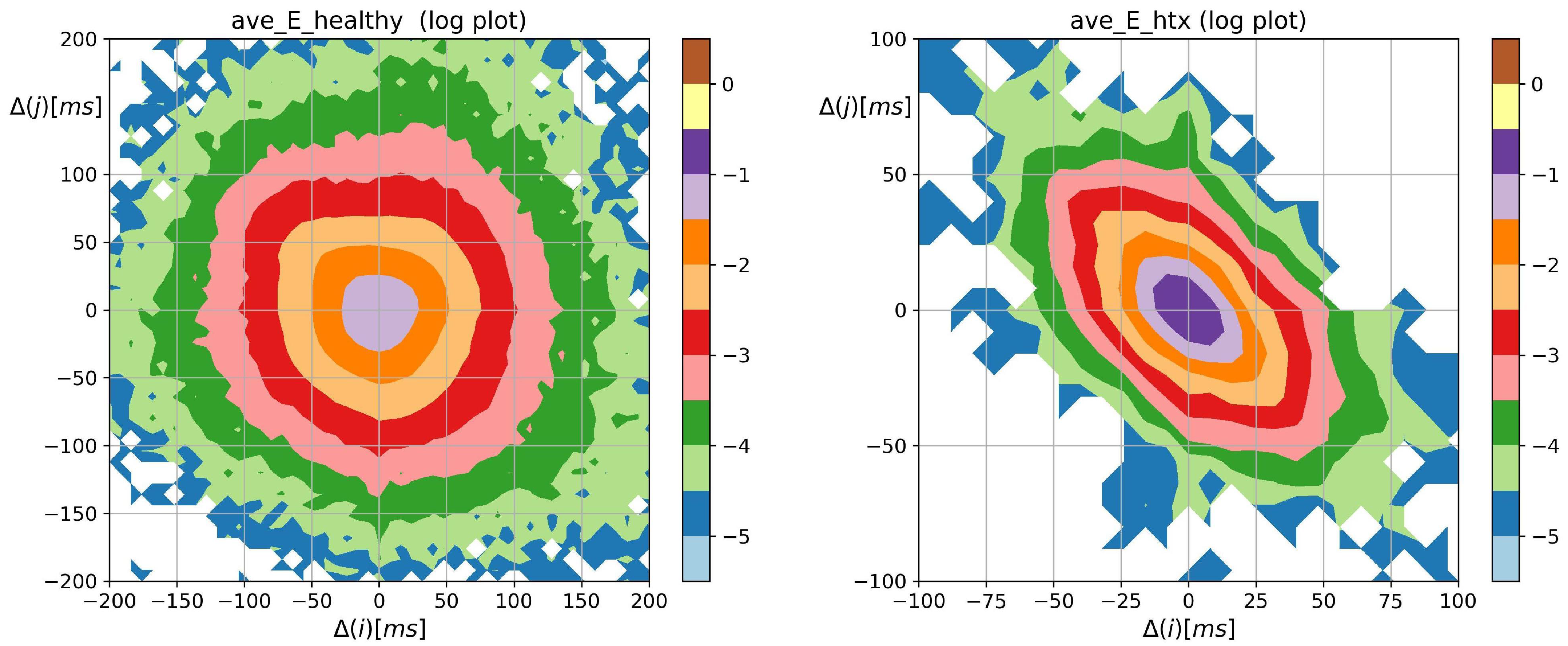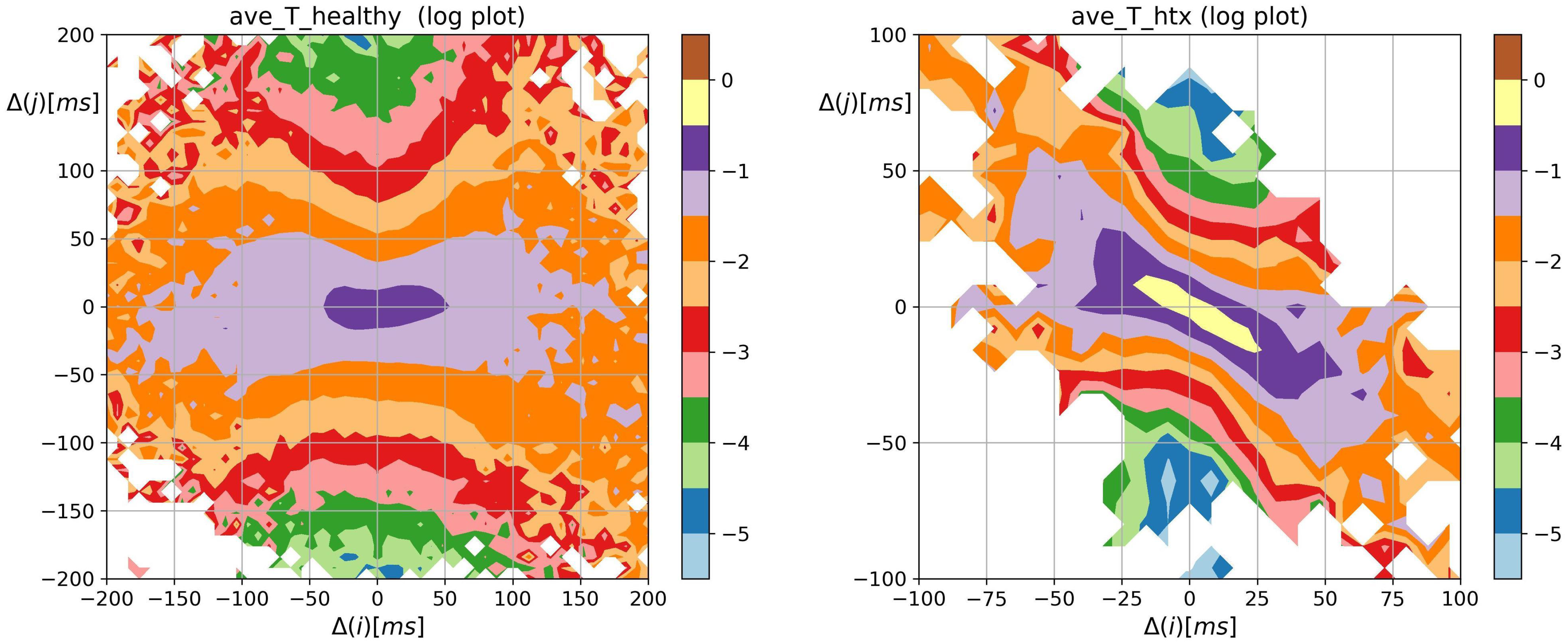 In Figure A1, we show the means of probability matrices , where two events, i.e., and then , may occur sequentially in a typical RR increment signal belonging to the HTX patient group.