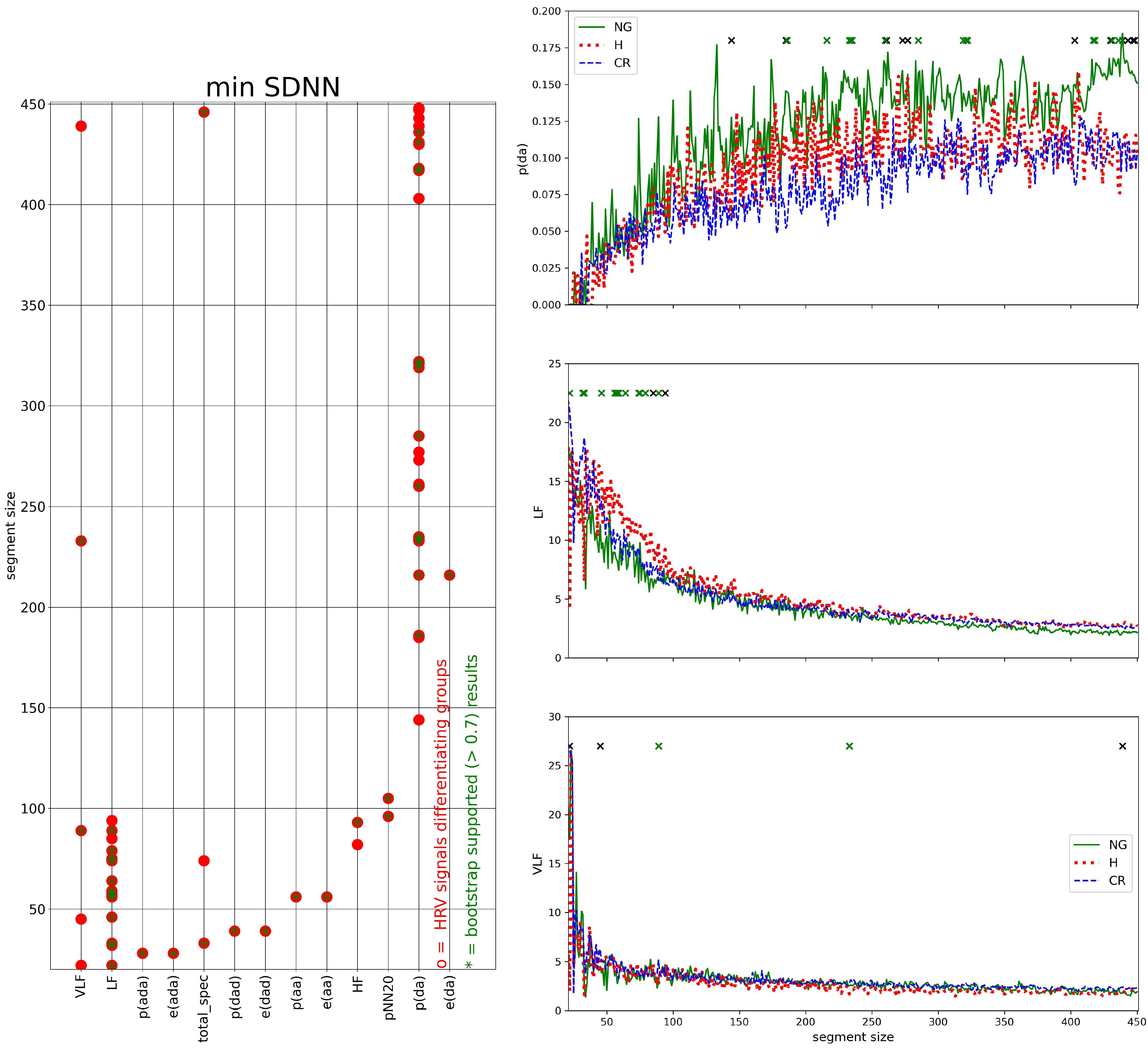 The moving window analysis was performed with segments consisting of more than 20 and less than 450 RR intervals. For a given s, each signal was split into equal size segments consisting of s normal-to-normal RR intervals. Then a given HRV measure was calculated in each window separately. The two types of analysis were applied: