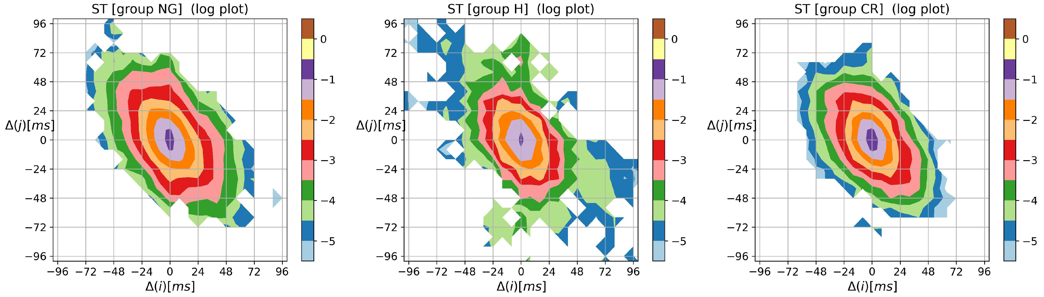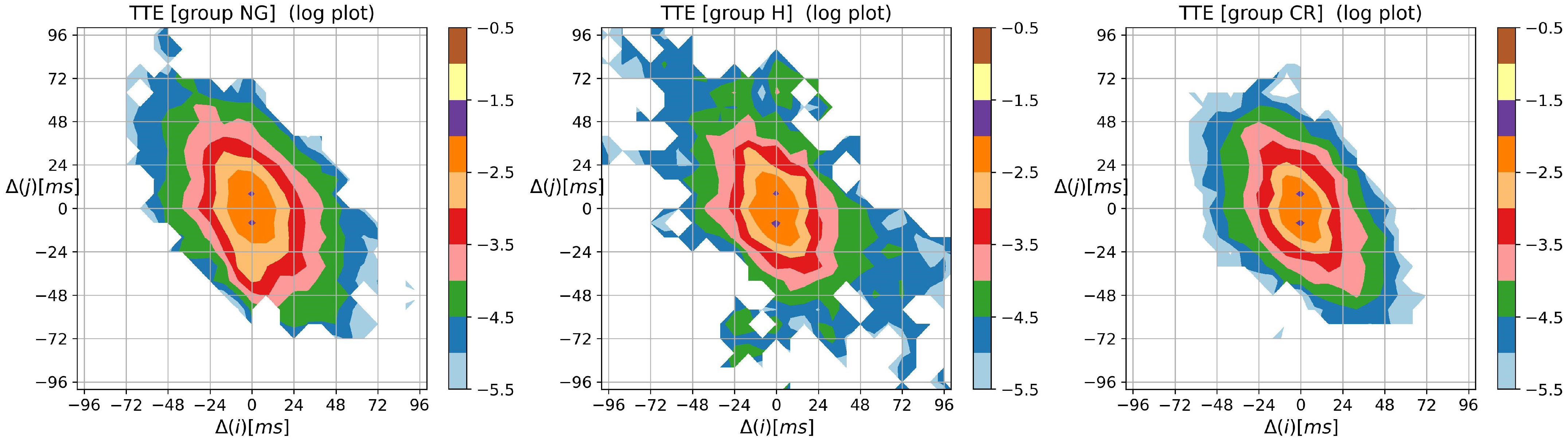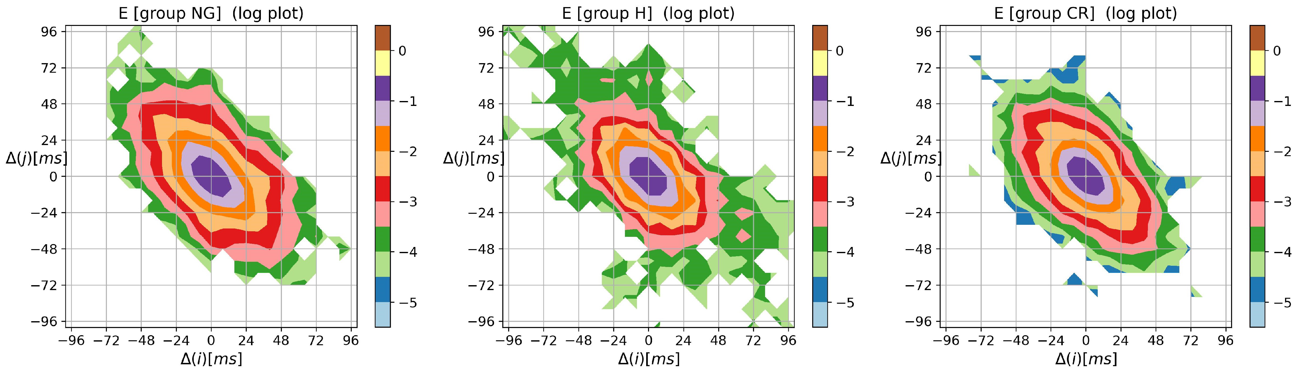 The contour plots of probability (in the logarithmic scale) to meet an event: followed by , obtained from signals of RR intervals pooled in groups NG, H, and CR. means the magnitude in ms of a deceleration, , or acceleration, .