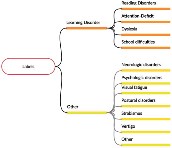 We obtain annotations from clinicians’ reports of patient information and eye tracker records. This information includes predefined categories such as age, details on the eye movement task performed, and a text description of each patient’s reasons for seeking orthoptic attention. Patients are grouped into ten pathologies, including dyslexia and learning disorders, strabismus, vertigo, presbycusis, vergence-accommodation disorders, low vision, and motor restlessness. Subsequently, we cluster multiple families of disorders to form the final labels, considering that dyslexia and learning disorders contain dysgraphia, dysorthographia, dyscalculia, and learning disability. Figure 2 lists the main groups present in each class, using a tree structure.