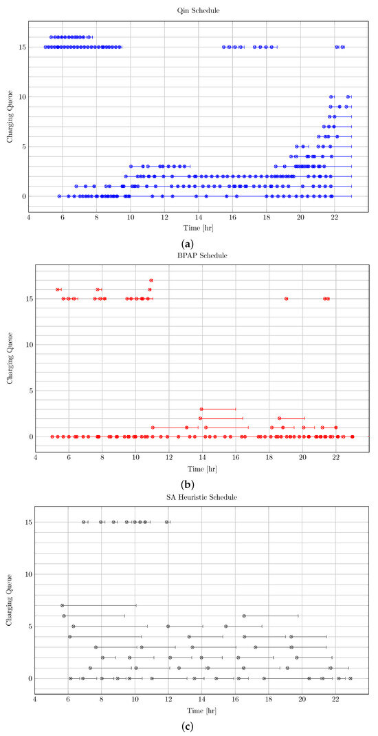 An example of the SA PAP algorithm was presented and compared against the BPAP, which acted as a baseline for the other schedule. Another threshold-based strategy called the Qin-Modified technique was also introduced as a means of comparing the schedules. The SA PAP was run utilizing two different neighborhood searching techniques named the “quick” and “heuristic” techniques, respectively. The quick SA’s objective was to randomly search a wide neighborhood while the heuristic technique was designed to incrementally search a neighborhood by randomly selecting a fast or slow charging queue and then stepping through the queues one at a time. The execution time compounds as the number of iterations in the cooling function increases as shown by the respective quick and heuristic execution times: 1532.8 s and 1916 s. The Qin-Modified strategy favored the use of fast chargers due to its inability to identify when demanding routes were on the horizon, whereas the other methods used fast charges sparingly. Particularly, the SA techniques favored higher number of slow chargers with longer charge durations in comparison to the BPAP.