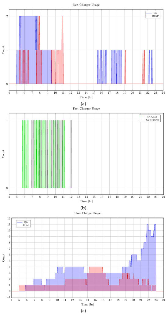 The charger utilization over the time horizon for each method is shown in Figure 6. Figure 6a shows that the Qin and BPAP employed between one and two fast chargers during the first eleven hours of the working day. The Qin heavily utilizes two fast chargers between hours five and eight to charge all the BEBs above the low threshold. Once the BEBs rose above the low threshold, both the Qin and BPAP utilized the fast chargers more sparingly throughout the working day. However, the difference between the BPAP and the Qin use of the fast chargers is that the BPAP is able to utilize the fast chargers only when required, such as when a long route is on the horizon and the BEB requires a higher initial SOC for visit i (as seen with the Qin SOC reaching 0%). A similar result for both the quick and heuristic SA technique can be seen in Figure 6b; however, both SA methods only require one fast charger, albeit more frequently than the BPAP. After the twelfth hour, neither quick nor heuristic SA methods require the use of fast chargers. This observation is predominantly due to the addition of the demand cost and the fact that it is applied throughout the entire working day. This becomes more clear when viewed in reference to Figure 6c,d. Comparing the slow charger use of the BPAP and Qin versus the quick and heuristic SA methods demonstrates that the charging completed by the fast chargers for the BPAP and Qin was heavily subsidized by slow chargers in the quick and heuristic SA techniques. The SA techniques, however, were still able to detect future demands and offset BEBs to the fast charger only when required. This effectively allowed the consumption costs to be reduced so that the SA techniques remained competitive with the BPAP (Figure 5), but the included demand cost allowed both SA methods to perform better than the BPAP with regard to peak demand (Figure 4).