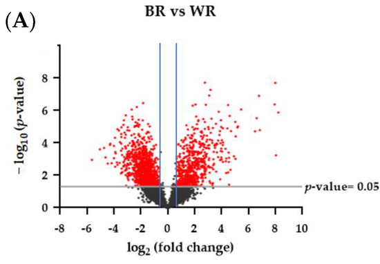 Volcano plots between black and white rice (BR vs. WR) (A), red and white rice (RR vs. WR) (B), and black and red rice (BR vs. RR) (C). The protein abundance data were plotted on a log2 scale (x-axis) versus a –log10 transformation of the p-value (y-axis). A significant cut off (p < 0.05) was set (grey line on the y-axis) and the significant up- and down-regulated proteins were determined using ± 1.5-fold change, respectively. BR vs. WR: 195 and 481 significant up- dan down-regulated proteins, respectively (A); RR vs. WR: 192 and 448 significant up- and down-regulated proteins, respectively (B); and BR vs. RR: 163 and 101 significant up- and down-regulated proteins, respectively (C).