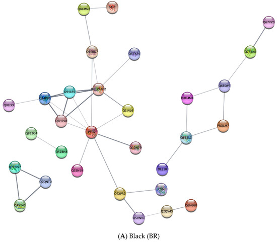 Protein–protein interactions (PPIs) network between differential expression proteins (DEPs) in black (PH9 and BALI), red (MRM16 and MRQ100), and white (MRQ76 and MR297) rice. Colors indicate nodes of different types of protein. A total of 30, 13, and 35 DEPs were interacted in black, red, and white rice varieties, respectively (A–C).