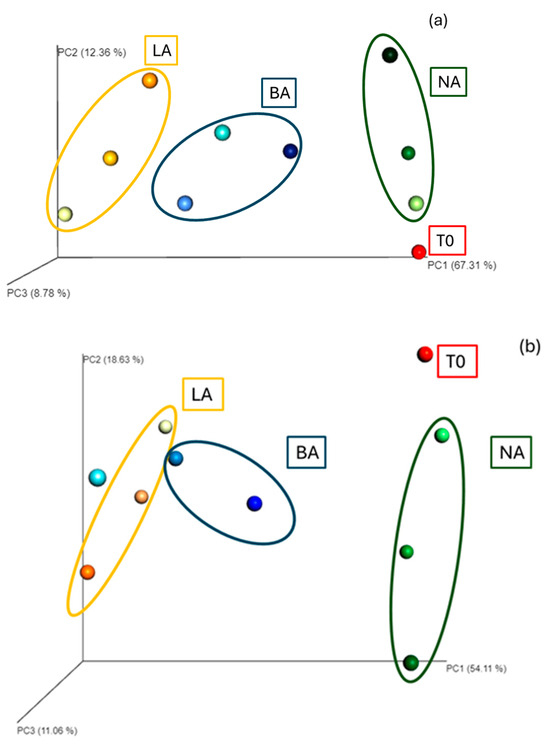 T0: initial time; T1: 30 days; T2: 60 days; T3: 90 days; NA: natural attenuation; BA: bioaugmentation with fresh beads; LA: bioaugmentation with lyophilized beads; (a) Euclidean distance representation of beta diversity at the genus level of the NA, BA and LA treatments; (b) Bray–Curtis distance representation of beta diversity at the genus level of the NA, BA and LA treatments; (c) Euclidean distance representation of beta diversity at the genus level of the NA, L and LB treatments; (d) Bray–Curtis distance representation of beta diversity at the genus level of the NA, L and LB treatments. Light, middle and darker intensity colors represent the diversity at 30 days, 60 days and 90 days, respectively. In this case the Principal Coordinate Analysis shows significant clustering for the different treatments.