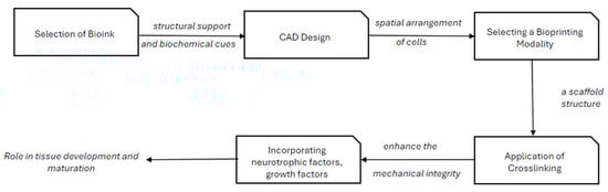 The 3D bioprinting of neural tissue involves fabricating 3D structures composed of biomaterials and living cells to replicate the architecture and functionality of native neural tissue. Generally, with the preparation of bioink, which is a specialized material containing living cells, biomaterials, and growth factors, the 3D-bioprinting process starts [,,]. Bioink provides structural support and biochemical cues for the structure of cell growth and tissue regeneration. Then, a computer-aided design (CAD) model is generated to define the spatial arrangement of cells and other components in the desired neural tissue structure [,]. Then, a bioprinting modality is applied to achieve a scaffold structure. There are various bioprinting techniques, among which extrusion-based, inkjet-based, or laser-based methods are popular [,,,,,,]. In some cases, crosslinking is applied to the process to enhance the mechanical integrity of the structure []. For the sake of the post-processing phase, incorporating neurotrophic factors, growth factors, and signaling molecules into the bioink formulation can play a significant role in tissue development and maturation [,,,]. Alongside these basic steps, additional steps may be incorporated based on specific requirements dictated by the condition being addressed [,]. A general overview of the 3D bioprinting of neural tissue is depicted in Figure 1.