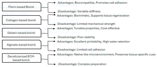 Overall, bioink plays a pivotal role in 3D bioprinting, with fibrin-based and collagen-based bioinks being the most commonly used due to their biocompatibility and ability to support tissue integration [,,,,,]. Additionally, other bioinks, such as gelatin-based, alginate-based, and decellularized ECM-based bioinks, offer unique properties and applications, contributing to the versatility of bioprinting in tissue engineering and regenerative medicine [,,,,]. Figure 3 provides a general overview of various bioinks along with their respective advantages and disadvantages.