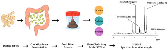The integration of metabolomics and microbiota sequencing data provides a comprehensive view of the functional interplay between microbial communities and their metabolic outputs. While microbiota sequencing (e.g., 16S rRNA or shotgun metagenomics) reveals the taxonomic composition and functional potential of microbial ecosystems, metabolomics captures the small molecules produced or modified by these microbes and the host. Combining these datasets enables researchers to link microbial taxa or genes to specific metabolites, uncover biomarkers, and elucidate mechanistic pathways underlying host-microbe interactions. Thus, the biochemical interplay between dietary components and microbial metabolites can be comprehensively studied through NMR-based metabolomics. This methodological strength makes NMR particularly suitable for studying microbiota–diet relationships, as it allows longitudinal monitoring of systemic and gut-derived metabolic changes in response to dietary interventions [,]. One of the clearest examples of this interaction is the relationship between dietary fiber intake and the production of microbial-derived SCFAs. Dietary fibers, being non-digestible carbohydrates, reach the colon intact, where they undergo fermentation by gut microorganisms, yielding SCFAs such as acetate, propionate, and butyrate [,]. These metabolites act as signaling molecules with broad physiological roles, influencing gut barrier integrity, immune modulation, and host energy metabolism. NMR-based metabolomics offers unique advantages for the direct detection and quantification of SCFAs, as this spectroscopy technique can identify acetate, propionate, butyrate, and other fermentation products such as lactate and succinate in fecal water extracts [,,] (Figure 1). Beyond detection, the integration of metabolomic data with multivariate statistical approaches enables the identification of distinct SCFA profiles associated with high-fiber diets, for example those rich in whole grains, legumes, and fruits, compared to low-fiber dietary patterns [,].