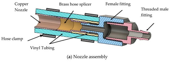 Figure 3a,b show the test tip assembly. The brass hose splicer was connected to the copper nozzle and barbed barb × Male Ion Pipe (MIP) adapter female fitting (ϕ3.175 mm × ϕ6.25 mm) with a Ø6.25 mm vinyl tubing. The tubing was wrapped in ϕ9.525 mm vinyl tubing to add rigidity when securing the hose clamps. The smooth, partially threaded, and threaded 3.175 mm × 6.35 mm diameter barbed barb × MIP adapter male fitting was screwed into the female fitting.