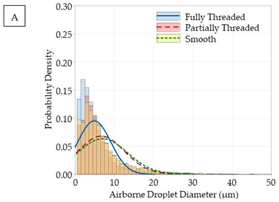 The opposite trend, however, was observed for the higher viscous and higher surface tension of lubricant LB. The oil droplets were larger (Figure 7a) and adhered to the rough surface of threaded channel. This caused them to not be recirculated into the downstream flow by very low air velocity within a thread. Therefore, the droplets are larger and fewer airborne droplets were collected (Figure 7b).