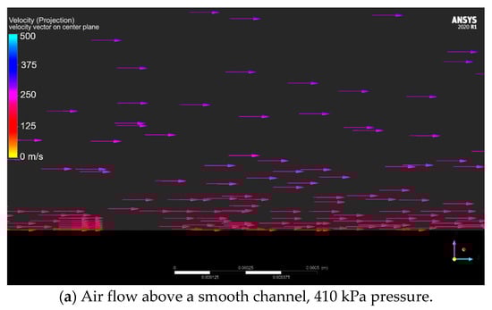 Effect of channel roughness air flow. (a) Air flow above a smooth channel, 410 kPa pressure. (b) Air flow above partial threaded channel, 410 kPa pressure. (c) Air flow above fully threaded channel, 410 kPa pressure.