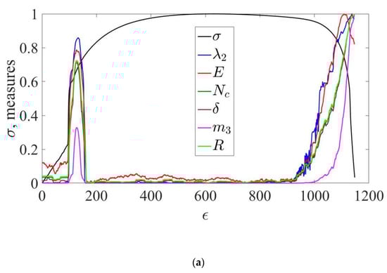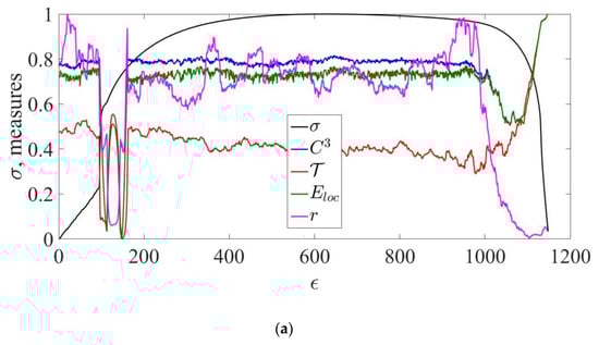 The choice of the recurrence threshold parameter has been extensively studied in the literature [,,,]. Often, the decision of selection of the recurrence threshold depends on the data analyst himself and his understanding of the system being studied. Choosing , will cause our network to be very sparsed. If , the network will be highly connected. Studying the dynamics of the stress–strain curve with the sliding window procedure, we need to be adaptable to the structure of the studied subspace of the system. Starting the selection of from very large values will cause a high dense edge distribution of the network. Such a large amount of less important interconnected nodes will hide all feasible information about the studied system. The necessary information is best preserved when the threshold is sufficiently small, whereas the choice of sufficiently large would be effective for dealing with noise []. It is worth considering that the studied series is not smoothed: the transition from elastic to plastic deformation and the stage of fracture have very high rises and falls in the fluctuations of their initial values and returns. This can break the connections between different components of the series since the distance between points that characterize those stages and the points of other areas would exceed []. These unconnected components would make the shortest path length that would cause problems with the computation of some graph-based indicators.