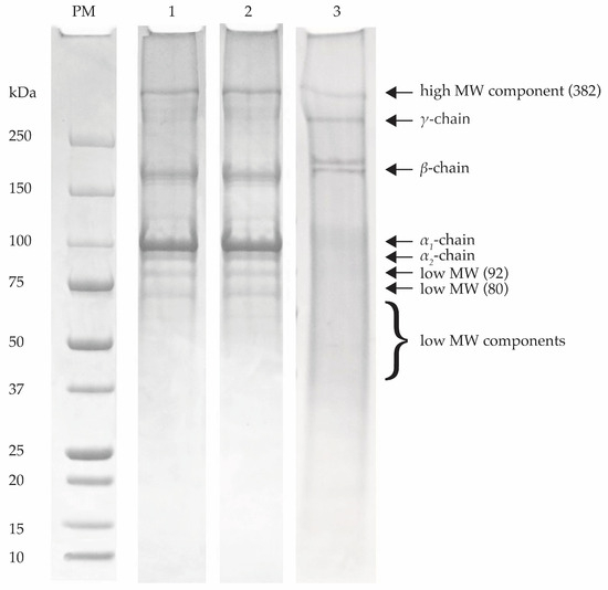 The electrophoretic profile of BC skin gelatin under non-reducing and reducing conditions, as well as of porcine skin gelatin, is shown in lanes 1, 2 and 3 of the electrophoregram, respectively (Figure 1). No noticeable differences were observed in the protein patterns of fish skin gelatin in the presence or absence of β-ME (lanes 1 and 2), suggesting that disulfide bonds do not contribute to the stabilization of the protein gel structure. As shown in Figure 1, the MW distribution of fish skin gelatins was typical of gelatin preparations comprising α- (monomer), β- (two covalently cross-linked α-chains, dimer) and γ-chains (three covalently cross-linked α-chains, trimer), which are the undisputed protein fragments in gelatin extracts []. In particular, the α component displayed two α-chains, namely, the α2- and α1-chains with MWs of ~101 and 114 kDa, respectively, while the MWs of the β- and γ-chains were approximately 217 and 340 kDa, respectively. These findings were in good agreement with those previously reported for gelatin extracted from the bones of Atlantic mackerel (Scomber scombrus) and blue whiting (Micromesistius poutassou), as well as from bovine corium [,]. Besides the aforementioned components, three additional discernible protein bands were observed in both lanes (1 and 2) with MWs of ~382, 92 and 80 kDa, which were characterized as high-MW (HMW) and low-MW (LMW) components.