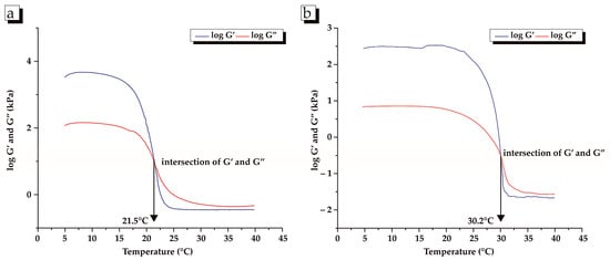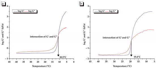 Changes in the dynamic viscoelastic profile of BC and porcine skin gelatin as a function of temperature were monitored during cooling from 40 to 5 °C and subsequent heating from 5 to 40 °C with a scanning rate of 1 °C/min. (Figure 2 and Figure 3). Figure 2a indicates that fish gelatin forms a gel (i.e., setting point) at 10.5 °C, while the time required for gel formation (i.e., setting time) is 29.5 min. On the other hand, porcine skin gelatin forms a gel at a significantly higher temperature (19.4 °C) and shorter time (20.6 min) than fish skin gelatin (Figure 2b, Table 4, p < 0.05).