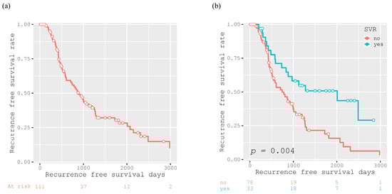 The 1-year, 3-year, and 5-year RFS rates of the participants were 84.0%, 42.0%, and 28.3%, respectively, and the median RFS was 882 days (Figure 4a). Patients who achieved SVR after curative treatment had a significantly longer recurrence-free survival than those who did not (p = 0.004; Figure 4b). However, there was no significant difference in the RFS between patients who achieved SVR with DAA and IFN therapy (p = 0.251; Figure 4c).