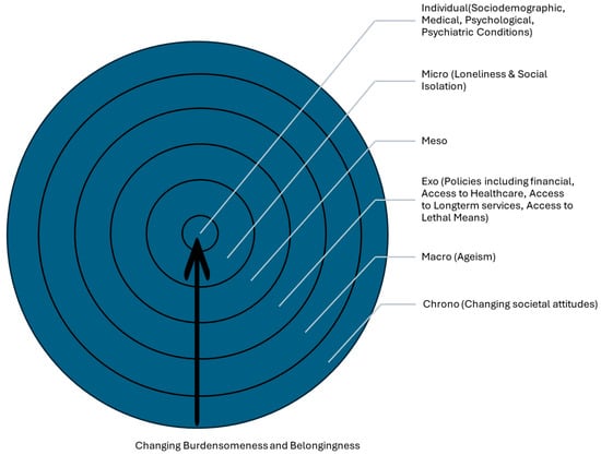 In the following discussion, we will use the socioecological framework and discuss how the various nested systems can influence perceived burdensomeness and a sense of belongingness thus shaping the risk of suicide among the elderly. This review employed an integrative review approach with systematic elements to synthesize empirical and theoretical literature relevant to the socioecological model, which was subsequently integrated with the Interpersonal Theory. A comprehensive Google Scholar and PubMed search was conducted for articles published between January 2000 and March 2025. Eligible studies were peer-reviewed empirical or review articles published in English and focused on the elderly population. We specifically examined studies addressing predetermined risk factors informed by the socioecological model, including: