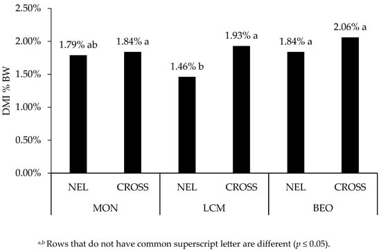 Crossbreeds presented a greater DMI than NEL, which is in accordance with the literature that reports that Bos taurus taurus presents with a greater DMI than Bos taurus indicus [,]. Nevertheless, the feed efficiency did not differ between the two racial groups; therefore, the difference observed in ADG is most likely a result of the greater DMI in the CROSS animals. Similarly, Goulart et al. [] observed that Aberdeen Angus × Nellore crossbred steers presented with a greater final shrunk BW, ADG, and DMI than Nellore purebred steers.