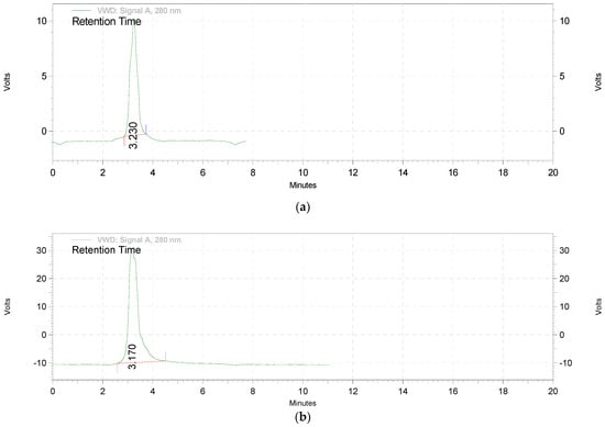 The ex vivo permeation of EGCG was carried out using HPLC analysis. The HPLC chromatogram displayed a sharp peak for ECGC at an average retention time of 3.23 min. The peak for EGCG in GTE and GTE-SD was displayed at the same retention time (3.17 min) and 3.26 min, respectively, thereby confirming its presence in the extract (Figure 8). The permeation of EGCG from GTE was found to be 10.43%. In the case of F1 (1:2), the permeation of EGCG was 12.03% and found to increase with the increase in the ratio of GTE-SD, as observed in F2 and F3 given in Figure 9. In the case of F2 and F3, the rate of permeation of ECGC was found to increase by 28.26% and 26.09%, respectively. The reason for this could be due to the formation of smaller micelles; this is because as the concentration of Soluplus® increased in the GTE-SD, the added molecules of Soluplus® might have become adsorbed onto the surface of existing micelles, thereby reducing their size by providing steric stabilization. Also, the smaller the size of the micelles, the higher their surface area, which allows more surface for more direct contact with the surrounding medium. This might have made it easier for the molecules of EGCG to permeate, thereby resulting in a higher permeation of EGCG. On the other hand, when the concentration of Soluplus® was increased further in F4 and F5, the permeation of EGCG was found to decrease. In the case of F4 and F5, the permeation of EGCG was 14.57% and 13.07%, respectively. The reason for this could be the formation of micelles with a large particle size; the addition of excess polymer might have resulted in the formation of larger aggregates. The larger micelles which formed in turn might have provided a smaller surface-area-to-volume ratio, thereby creating a large barrier for the diffusion of EGCG-encapsulated micelles, thus resulting in its lower permeation. Also, with the increase in the concentration of the polymer, an increase in the viscosity of the solution was observed, which additionally might have contributed to the lower permeation of EGCG. Hence, from the ex vivo permeation studies, it was clear that GTE-SD in the ratio of 1:4, 1:6, and 1:8 exhibited the permeation of EGCG due to the effect of micelle formation. Additionally, the apparent permeability coefficient of pure GTE and the various ratios of GTE-SD was also calculated using Equation (1). The results are shown in Figure 9a. The results obtained for Papp were analyzed using one-way ANOVA followed by Sidak’s multiple comparisons test, which also emphasized that the permeation of F2, F3, and F4 was statistically significant ((p < 0.0001), (p < 0.0001), (<0.001), respectively), as compared to the pure GTE.