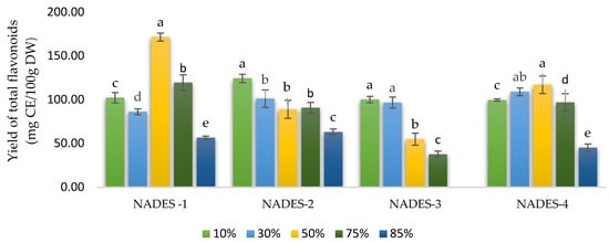 Total flavonoid extraction yields for natural deep eutectic solvents (NADES-1 to NADES-4) according to the percentage of NADES in water, 1:10 solid–liquid ratio and 30 min of extraction. a–e: different letters indicate that there are statistically significant differences (p < 0.05).