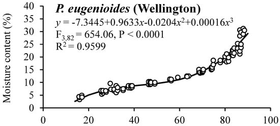 The observed moisture sorption isotherms for mature seeds of P. eugenioides and P. crassifolium collected in Palmerston North and Wellington are shown in Figure 2. Both species showed a similar behaviour irrespective of their harvesting location, having RH values between 26 to 87% and SMC values between 4 and 30%.