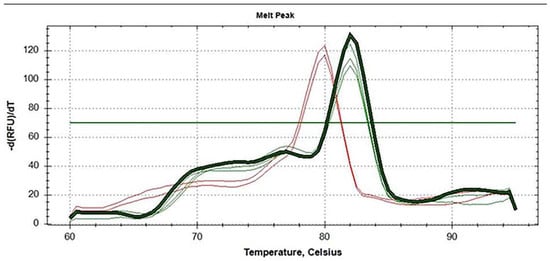 Melt curve analysis of amplicons obtained in allele-specific PCR with a DNA template of: subsp. holarctica strains 1045 and 15 NIIEG (red lines) and subsp. mediasiatica strains A-678 (M.II lineage), 120, 117 (M.I lineage) (green lines), and strain K-334 (dark green bold line).