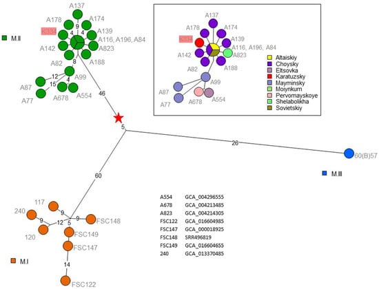 DNA libraries were prepared using the Nextera DNA Library Preparation Kit (Albiogen, Moscow, Russia). Whole-genome sequencing was performed using the MiSeq Illumina instrument and the corresponding reagent kit MiSeq Reagent Kit v3 (Albiogen, Moscow, Russia). WGS data from 17 newly published genomes are available at https://www.ncbi.nlm.nih.gov/sra/PRJNA870100 (accessed on 10 October 2022). Data for three previously described M.II genomes are available at the link indicated in [].