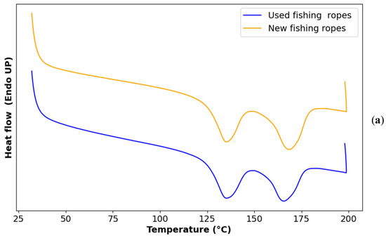 Figure 4 displays the DSC curves of the two types of ropes. Using Equation (2), it was determined that approximately 25% of both the used and new fishing ropes consisted of PE, while the remaining 75% was PP. Nevertheless, it is important to note that this estimation applied specifically to the batch of fishing ropes used in this study, considering the wide range of fishing ropes available in the market. Further studies are needed to explore the variability of rope composition and its potential influence on other the properties of the ropes.