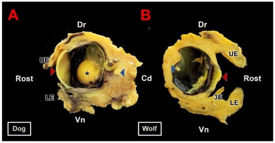Macroscopic section of the canid eyeball. (A). Sagittal section of the right eyeball of the dog along its optic axis. (B). Sagittal section of the left eyeball of the wolf. Samples fixed in Bouin’s fluid and postfixed in 70% ethanol. Cd, caudal; Dr, dorsal; LE, lower eyelid; UE, upper eyelid; Rost, rostral; Vn, ventral; 3E, third eyelid; *, lens; Red arrow, cornea; Blue arrow, retina.