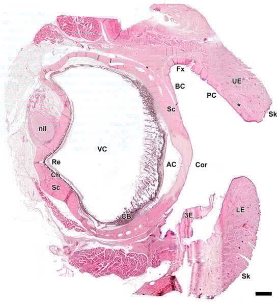 Microscopic sagittal section of the eye of Canis lupus signatus. AC, anterior chamber; BC, bulbar conjunctiva; CB, ciliary body; Ch, choroid; Cor, cornea; Fx, fornix; LE, lower eyelid; nII, optic nerve; PC, palpebral conjunctiva; Re, retina; Sc, sclera; Sk, skin; UE, upper eyelid; VC, vitreous chamber; 3E, third eyelid; *, tarsal glands. Hematoxylin–eosin staining. Scale bar = 500 µm.