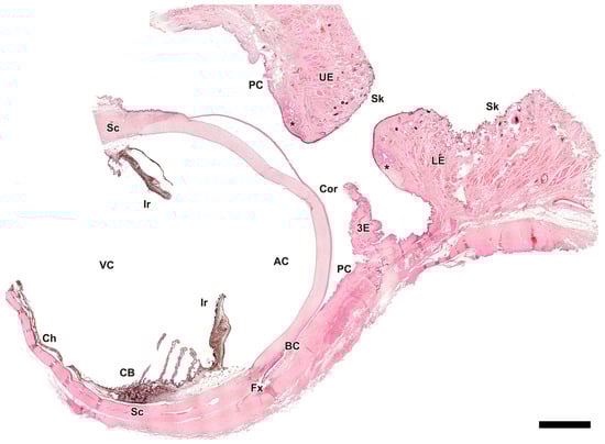 Microscopic sagittal section of the eye of Canis familiaris. AC, anterior chamber; BC, bulbar conjunctiva; CB, ciliary body; Ch, choroid; Cor, cornea; Fx, fornix; Ir, iris; LE, lower eyelid; PC, palpebral conjunctiva; Sc, sclera; Sk, skin; UE, upper eyelid; VC, vitreous chamber; 3E, third eyelid; *, tarsal glands. Hematoxylin-eosin staining. Scale bar = 500 µm.
