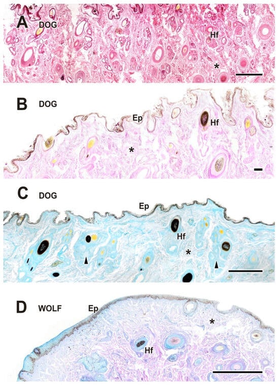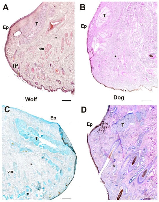 Histological study of the eyelid skin lining in the dog (A–C) and the wolf (D). The four histological stains used are hematoxylin–eosin (A), PAS (B), AB (C), and PAS-AB (D), which enable the characterization of the structure of the hair follicles, as well as the epidermis, dermis, and connective tissue development. Ep, epidermis; Hf, hair follicle; arrowheads, tubular glands; *, connective tissue. Scale bar: (A,C,D) = 500 µm; (B) = 100 µm.