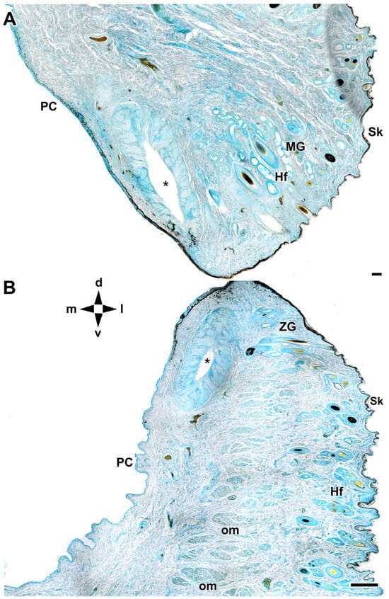 Microscopic anatomy of dog eyelids. The cross section allows identification of the main glandular elements of the upper (A) and lower (B) eyelid of the dog. d, dorsal; l, lateral; m, medial; PC, palpebral conjunctiva; Hf, hair follicle; MG, Moll’s gland; om, orbicularis muscle; Sk, skin; v, ventral; ZG, Zeis gland; *, tarsal glands. AB staining. Scale bar: (A) = 100 µm; (B) = 500 µm.