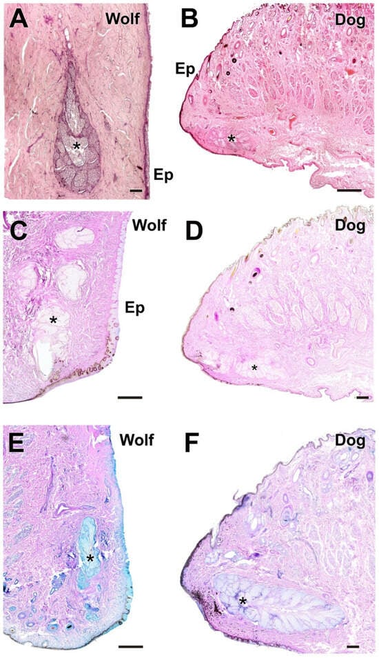 Histological images of dog and wolf upper eyelids stained with hematoxylin–eosin, PAS, and PAS-AB. They show the main glandular elements of the dog (B,D,F) and wolf (A,C,E) upper eyelid, the tarsal glands (*). Ep, epidermis. Histological stains: Hematoxylin–eosin (A,B); PAS (C,D); PAS-AB (E,F). Scale bars: (A,D,F) = 100 µm; (B,C,E) = 500 µm.