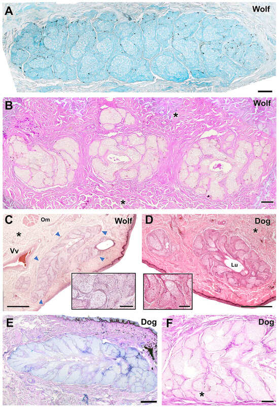 Histological study of the tarsal gland of the dog and wolf. In both species, wolf (A,B) and dog (E,F), the glandular secretion is acidic in nature, Alcian Blue-positive (A,E), and PAS-negative (B,F). (C,D) Hematoxylin–eosin staining reveals extensive development of the tarsal gland (arrowheads) in both wolf (C) and dog (D), with no striking differences. Only in the case of the dog does the large development of the lumen (Lu) stand out. In both species, the tarsal gland is negative for PAS staining, which, however, strongly stains the collagen fibers that form the surrounding connective tissue (asterisks). In the case of the wolf, the presence of aggregates of up to three lobes of tarsal glandular tissue is striking (B). Om, orbicularis muscle; Vv, veins. Staining: (A), AB; (B,F), PAS; (C,D), hematoxylin–eosin; (E), PAS-AB. Scale bar: (C–F) = 500 µm; (A,B) = 100 µm.