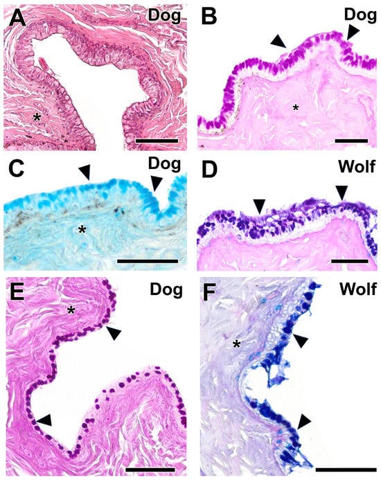 Histological study of palpebral conjunctiva and fornix in the dog and wolf. (A). Hematoxylin–eosin shows the remarkable thickness of the palpebral mucosa in the dog. (B,C). This morphological development corresponds with a remarkable expression of neutral (B) and acidic (C) mucopolysaccharides (arrowheads). (D,F). In the wolf, expression of acidic polysaccharides predominates in both the PC (D) and the fornix (F). (E). The dog fornix shows a remarkable expression of neutral mucopolysaccharides, both in the unicellular mucous glands and in the submucosal connective tissue (*). Stains: (A). Hematoxylin–eosin; (B,E). PAS; (C). AB; (D,F). PAS-AB. Scale bar: (A–F) = 100 µm.