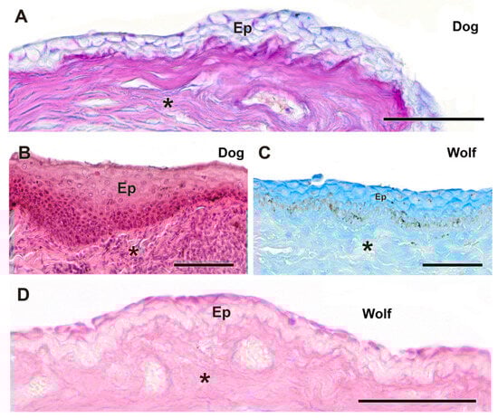 Histological study of the bulbar conjunctiva in the dog and wolf. (A,B) In the dog, the remarkable development of the stratified squamous epithelium is evident. The bulbar conjunctiva of the dog also shows a strong AB-positive reaction and a negative reaction to PAS (A). (C,D). In the wolf, the epithelium is thinner and exhibits an intense positive reaction to AB (C). (C). The wolf bulbar conjunctiva shows a certain reactivity to PAS, particularly on its luminal surface (D). Ep. Epidermis; *. Connective tissue. Staining: (A). Hematoxylin–eosin; (B). AB; (C). PAS-AB; (D). PAS. Scale bar: (A–D) = 100 µm.