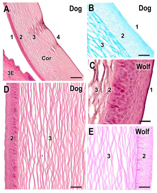Histological study of the cornea. (A). General structure of the dog cornea showing the distinct strata: (1) epithelium, (2) Bowman’s layer, (3) stroma, and (4) Descemet’s membrane. (B). Alcian Blue staining of the dog cornea, highlighting the intense staining of the stromal matrix (3), along with the epithelium (1) and Bowman’s layer (2). (C). Superficial corneal strata of the wolf, showing the epithelium (1), Bowman’s layer (2), and beginning of the stroma (3). (D). Histological structure of the superficial corneal strata in the dog. (E). PAS staining in the wolf cornea. 3E, third eyelid; Cor, cornea; 1. anterior epithelium; 2. anterior limiting lamina (Bowman’s layer); 3. corneal stroma; 4. posterior limiting lamina (Descemet’s membrane) + posterior epithelium. (A,C,D). H-E; (B). AB; (E). PAS. Scale bar: (A) = 500 µm; (B–E) = 100 µm.
