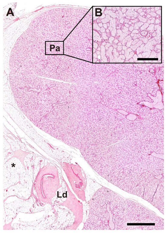 Histological structure of the lacrimal gland of the wolf. (A). General microscopic view of the gland. (B). Image of the parenchyma at higher magnification. Ld, lacrimal duct; Pa, Parenchyma; *, Adipose tissue; Stain: H-E. Scale bar: (A) = 500 µm; (B) = 100 µm.