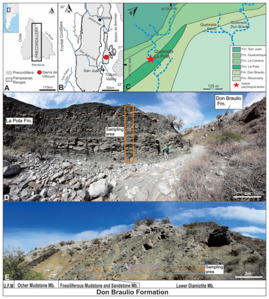 (A) Location map of San Juan in Argentina. A rectangle indicates the Precordillera. (B) Location of the Sierra de Villicum, Precordillera Oriental of Argentina, San Juan Province. (C) Geologic map of the Quebrada La Pola showing the section sampled. (D) Panoramic photograph of the sampling area in the upper part of the La Pola Formation. (E) Panoramic photograph of the Don Braulio Formation indicating the sampling area. Upper Ferriferous Member (U.F.M).