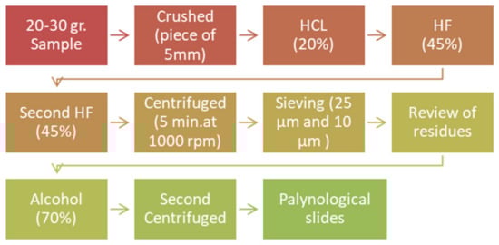 Flow chart summarizing the standard methodology applied in the Palynostratigraphy and Paleobotany Laboratory (LPP) of the CICYTTP Research Center (CONICET-ENTRE RÍOS-UADER), used in processing the samples from the Quebrada La Pola section.